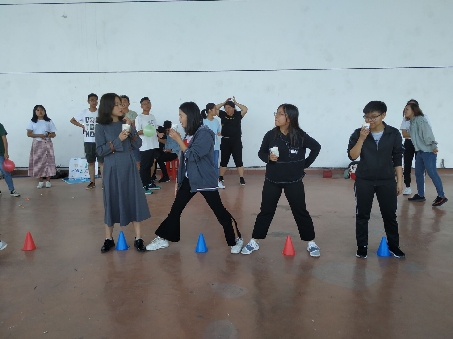 本次趣味文体活动分为六个游戏环节:爱的抱抱、背夹气球、衔杯传水、插秧收割、动感颠球、出彩法苑人。每项比赛共有两轮,参赛班级需要在同学们互相协作下赢下比赛。这不仅考验了团队成员的协作和沟通能力,更是在检验班级中长期培养出来的默契。最令人兴奋的是“衔杯传水”这一游戏环节,它要求小组队伍共同合作相互配合尽可能的把水多传给队友,并限时三分钟内完成。这对小组成员的交流合作和团队工作效率有着极大的要求。但这似乎更把每支参赛队伍的团队潜能激发出来了,每个队伍展示的默契和协作能力令人拍手叫好。