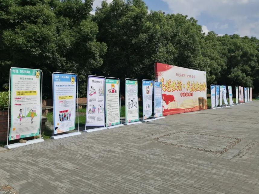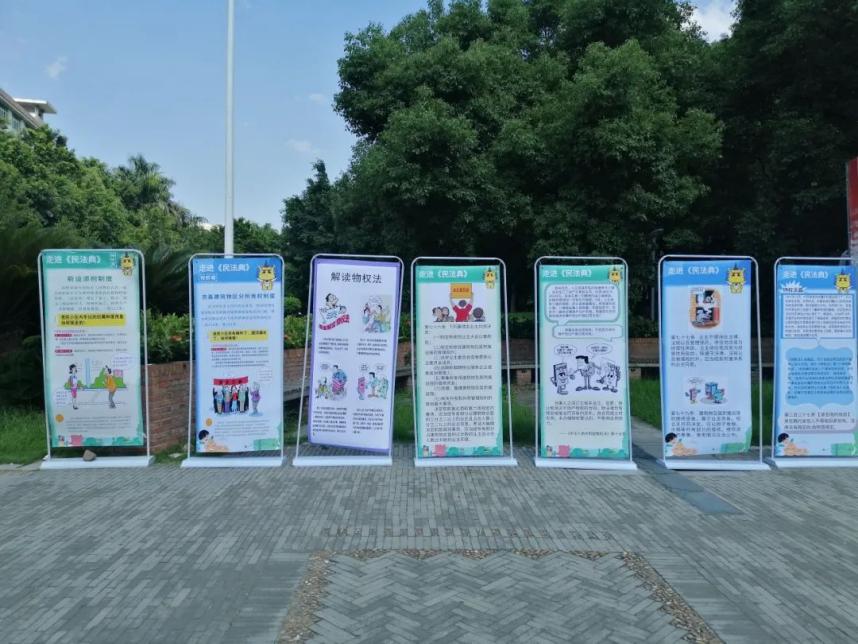 在现场,负责人员挂起了一排排有关《民法典》的知识的海报,加强了过往同学对其总则篇、物权编、合同编、人格权编、婚姻家庭编、继承编、侵权责任编的理解和认识,有利于形成严谨的法律意识,扩大了《民法典》的覆盖面和影响力。