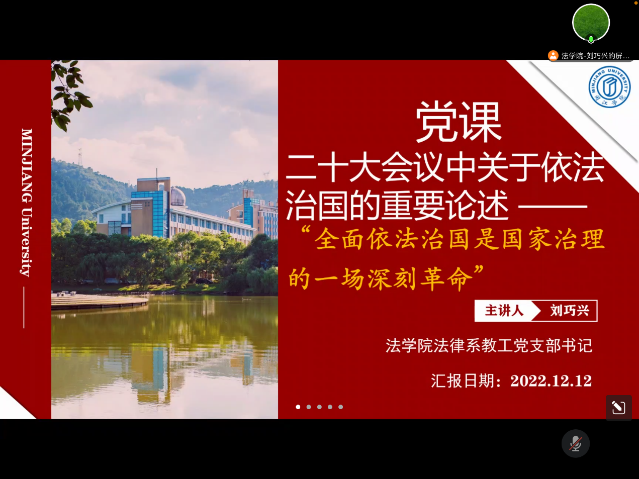 为深入学习贯彻党的二十大精神,牢固树立法治思维,威廉希尔williamhill法律系主任、法律系教工党支部书记刘巧兴于2022年12月12日向全体员工党员讲授党的二十大报告关于依法治国的重要论述。