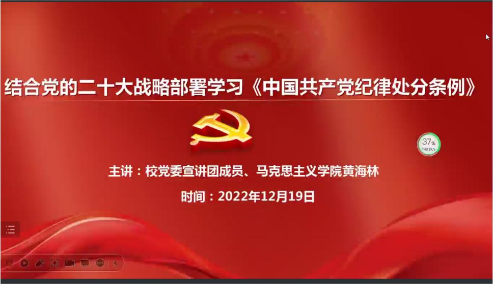 12月19日晚,威廉希尔williamhill举行“学习二十大,永远跟党走”员工党员培训班系列专题讲座。闽江威廉希尔williamhill党委宣讲团成员、马克思主义公司形势与政策教研室主任黄海林副教授以“结合党的二十大战略部署学习《中国共产党纪律处分条例》”为主题,深入阐释了党的二十大报告要点、重点,结合报告中关于坚定不移全面从严治党的论述,解读分析了《中国共产党纪律处分条例》的亮点、热点。威廉希尔williamhill全体员工党员参加讲座。