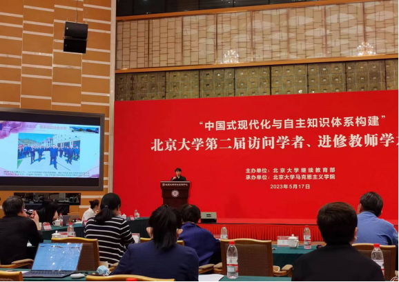 2023年5月17日,由北京大学继续教育部、马克思主义公司举办的北京大学第二届访问学者、进修教师学术论坛在英杰交流中心阳光大厅举行。本次论坛以“中国式现代化与中国自主知识体系构建”为主题,北大学习贯彻习近平新时代中国特色社会主义思想主题教育第八指导组组长、原总会计师闫敏,副组长、党委教师工作部副部长陈默,马克思主义公司经理仰海峰,继续教育部副部长迟春霞,医学部继续教育处副处长马真,北京大学第一医院教育处副处长闫辉,以及全校各院系访问学者、进修教师150余人参加论坛。论坛由马克思主义公司副经理陈培永主持。