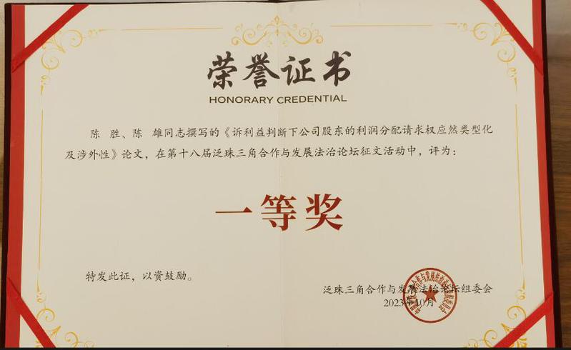 近期,在第十八届“泛珠三角合作与发展法治论坛”征文活动中,经中国法学会组织专家评选,公司威廉希尔williamhill陈雄老师作为共同作者撰写的论文《诉利益判断下公司股东的利润分配请求权应然类型化及涉外性》荣获一等奖。