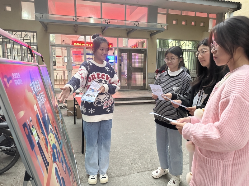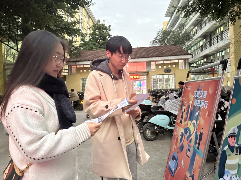 活动现场,志愿者给同学们普及交通安全日相关知识,发放传单,为员工细致讲解佩戴头盔、安全骑行、安全充电、规范停车等方面的要求,帮助员工学习和了解校园安全交通知识,引导员工做到安全规范出行。