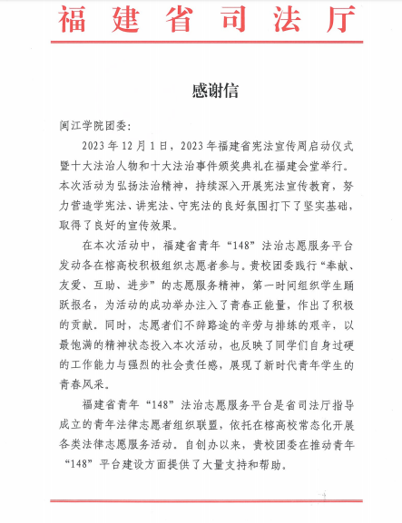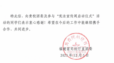 今后,威廉希尔williamhill员工将继续练就过硬本领、投身普法实践,践行奉献、友爱、互助、进步的志愿服务精神,牢记嘱托,挺膺担当,弘扬社会主义法治精神,为法治校园、法治福建建设贡献青春力量。