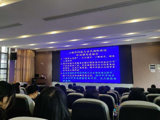 张海文研究员面向师生讲授了海洋科技对近代国际政治格局的构建发挥的重要推动作用,海洋科技为近代国际海洋法律规则形成提供的重要基础条件,并以BBNJ协定为例展开讲述了海洋科技与当代国际政治和法律高度融合。张海文研究员指出,海洋科技是当今大国竞争的内核,要鼓励更多海洋科技人才积极参与到全球海洋治理中,加快培养一大批跨学科、具有国际竞争力的海洋人才。