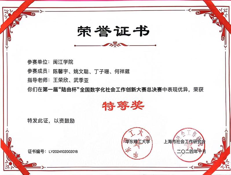 2024年10月19日至20日,由华东理工大学和上海市社会工作研究会联合主办,华东理工大学社会与公共管理公司及上海积途信息科技有限公司共同承办,上海高校智库社会工作与社会政策研究院协办的第一届“陆由杯”全国数字化社会工作创新大赛在华东理工大学徐汇校区成功举办。现场决赛,在王荣欣、武季亚两位老师的共同指导下,公司代表队成员陈馨宇、姚文聪、丁子珊和何祥葳,表现卓越,荣获本科组特等奖。