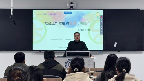 讲座伊始,傅婉霏以亲身经历为引,讲述踏上社工之路的缘由,以及创立乐志社会工作服务中心背后的质朴初心。一本梁漱溟的《这个世界会好吗》,阐释了乐志社会工作服务中心秉持的理念,瞬间拉近与同学们的距离,也让大家对社工精神和内涵有了更深体悟。随后,她列举福州市与深圳市社会工作行业在政府投入资金、人才数量、项目数量等方面的数据,指出在差距中暗藏希望,并表示2017年起闽侯县也紧跟步伐,将社工人才纳入人才体系,推出持证补贴政策,筑牢人才根基,让行业发展土壤愈发肥沃。谈及职业发展路径,她直言社工领域人才稀缺,晋升机会相较其他行业不遑多让,打破同学们对社工职业“晋升难”的刻板认知。
