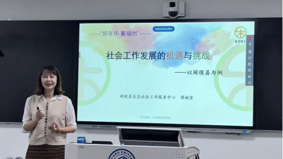 为助力社会工作专业学子明晰行业走向,把握当下机遇,直面挑战,2024年11月25日,应公司邀请,福州市社会工作联合会副会长、闽侯县乐志社会工作服务中心主任傅婉霏为公司社会工作专业员工开展讲座,讲座主题为“社会工作行业发展的机遇和挑战——以闽侯县为例”,讲座由威廉希尔williamhill副经理苏礼和主持。