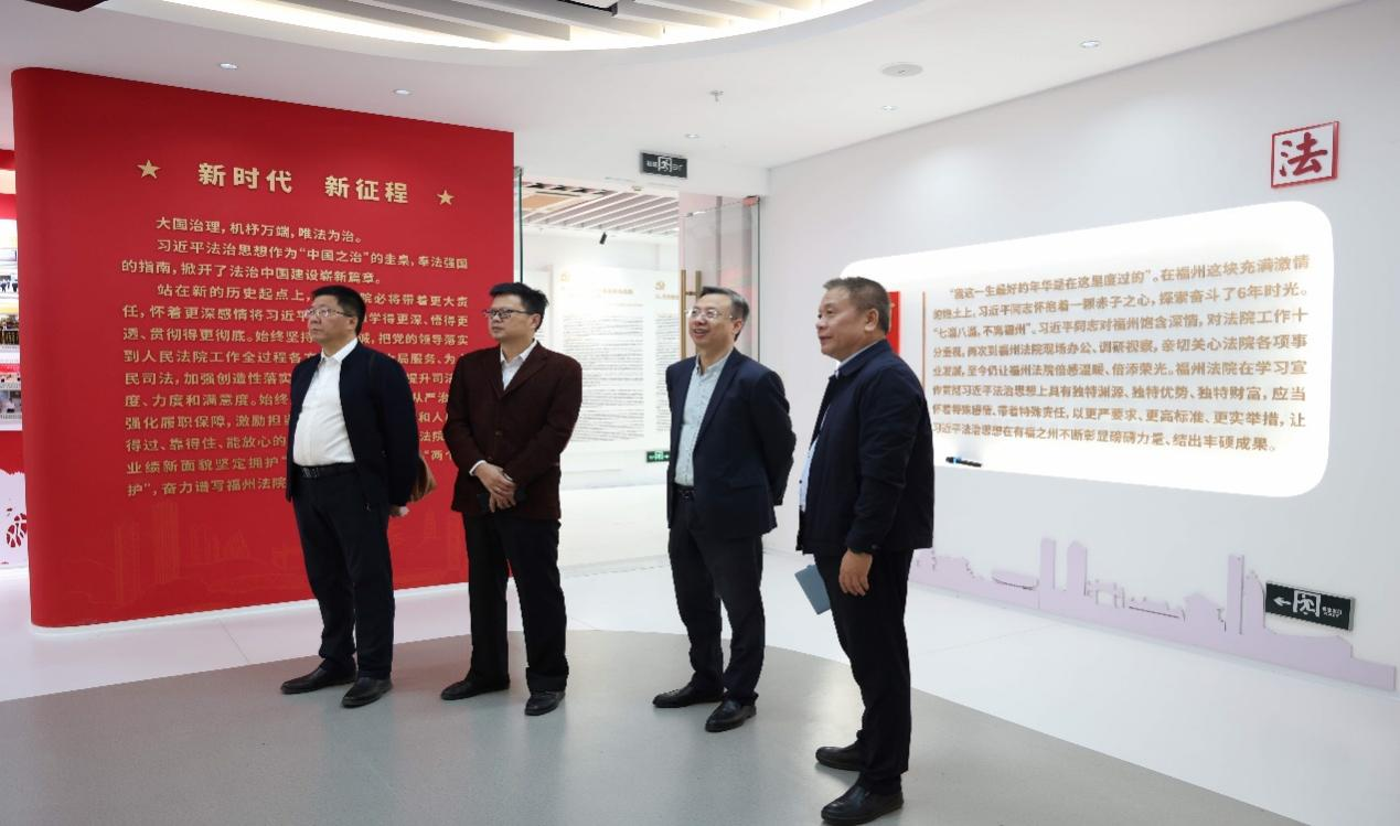 仪式结束后,在黄明广处长陪同下,林安民副经理、何华锋副书记等还参观了福州中院习近平法治思想学习宣传馆,观看了习近平总书记在福州工作期间到福州中院现场办公、视察调研的珍贵视频史料,通过照片及讲解,全面了解了福州法院系统在习近平法治思想指引下的生动司法实践。