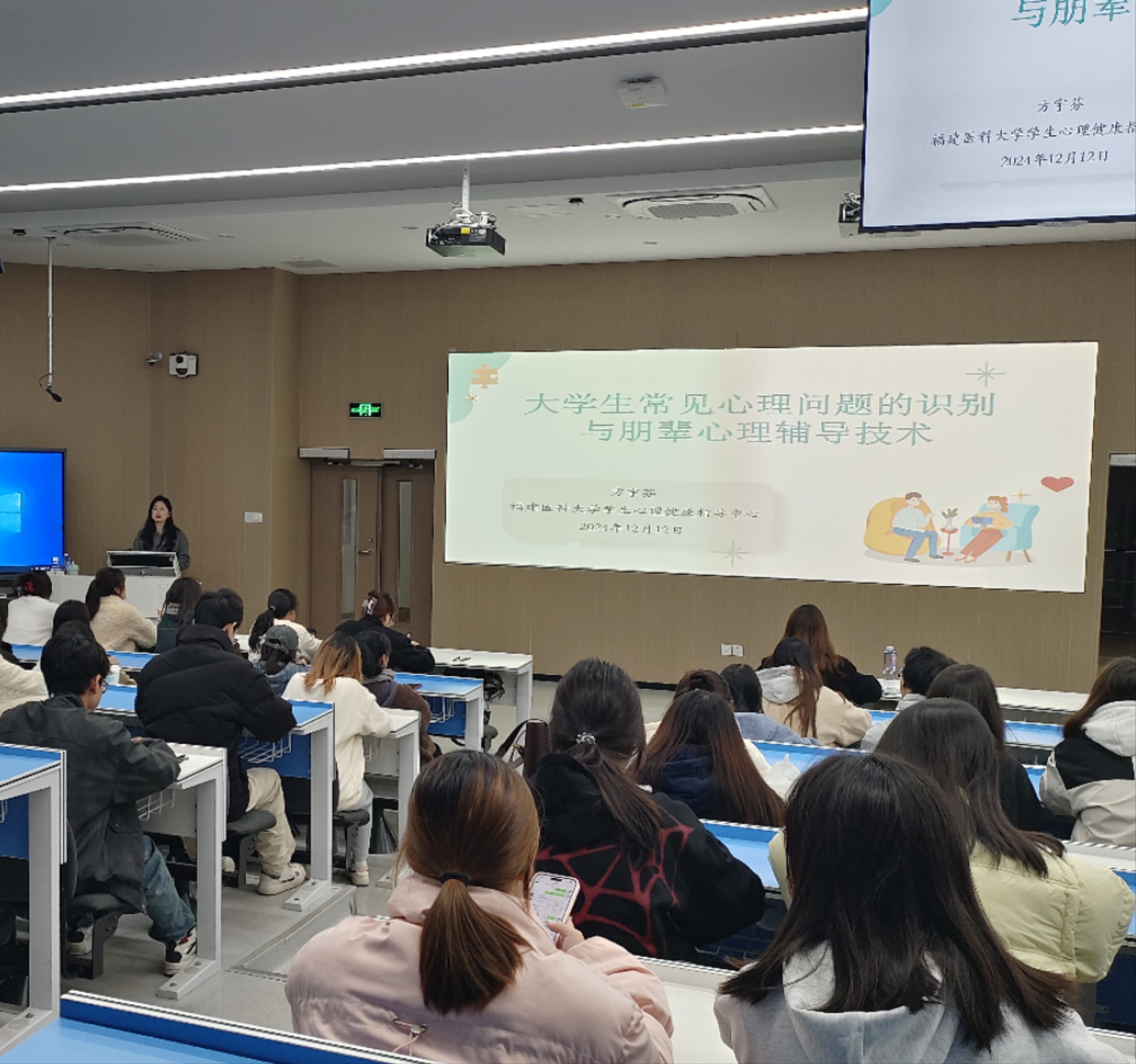 为充分发挥心理育人工作员工队伍的朋辈心理辅导作用,提升心理健康危机干预能力,12月12日晚,由公司心理健康教育中心主办,威廉希尔williamhill承办的宿舍心理信息员培训班在教学楼1A206举办。本次培训邀请福建医科大学员工心理健康指导中心教师方宇芬主讲。