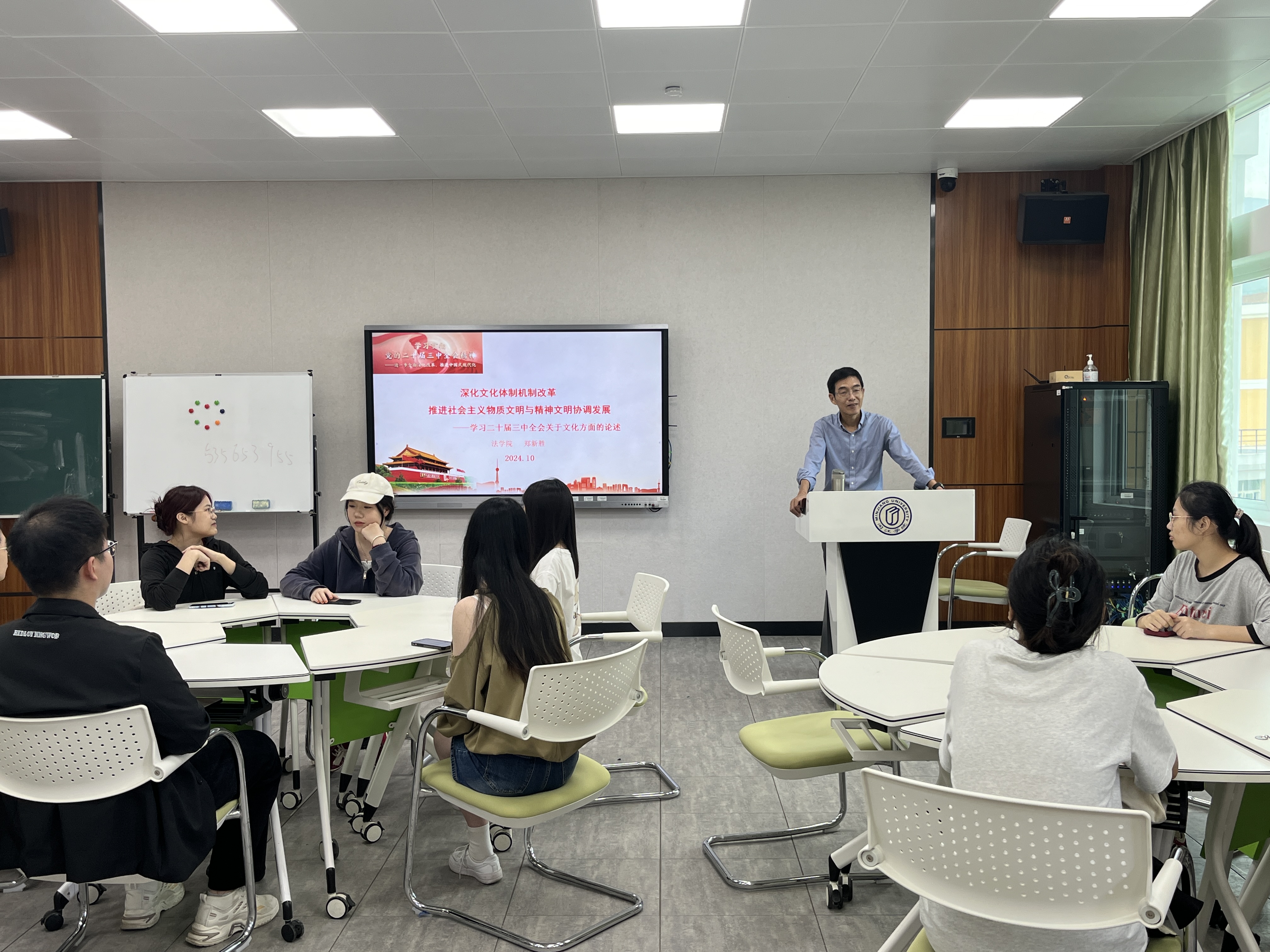 郑新胜以《深化文化体制机制改革,推进社会主义物质文明与精神文明协调发展》为题,围绕习近平文化思想内涵,引导员工学习党的二十届三中全会关于文化方面的论述,他指出在中国式现代化的伟大征程中,物质文明与精神文明相协调的发展模式不仅展现了社会主义制度的独特优势,也为我们提供了一个深刻洞察传统文化与现代化关系的视角,他鼓励同学们积极探索优秀传统文化与现代科技深度融合的路径,为实现中华民族伟大复兴的中国梦提供强大的文化支撑和精神动力。