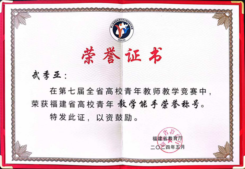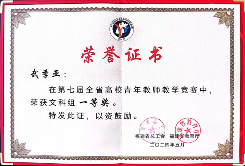 武季亚老师在任教之前,曾是一名经验丰富的社会工作师。在叠加教师角色后,她将社会工作实务中积累的人情、人性洞察融入课堂教学,员工反馈:“武老师的课堂让我们看到社会环境中的心理学呈现,让我们学会与自己和解,对他人同理。”正是得益于这样的教学改革,该课程荣获了校级示范课程的殊荣,武老师也在2024年第七届全省高校青年教师教学竞赛斩获了文科组一等奖,并荣获了福建省高校青年“教学能手”的荣誉称号。此外,她关于“加强社会心理健康服务体系建设的相关建议”的内参报告,还获得了省委领导的关注与肯定批示,直接为政府决策提供了有益的参考。