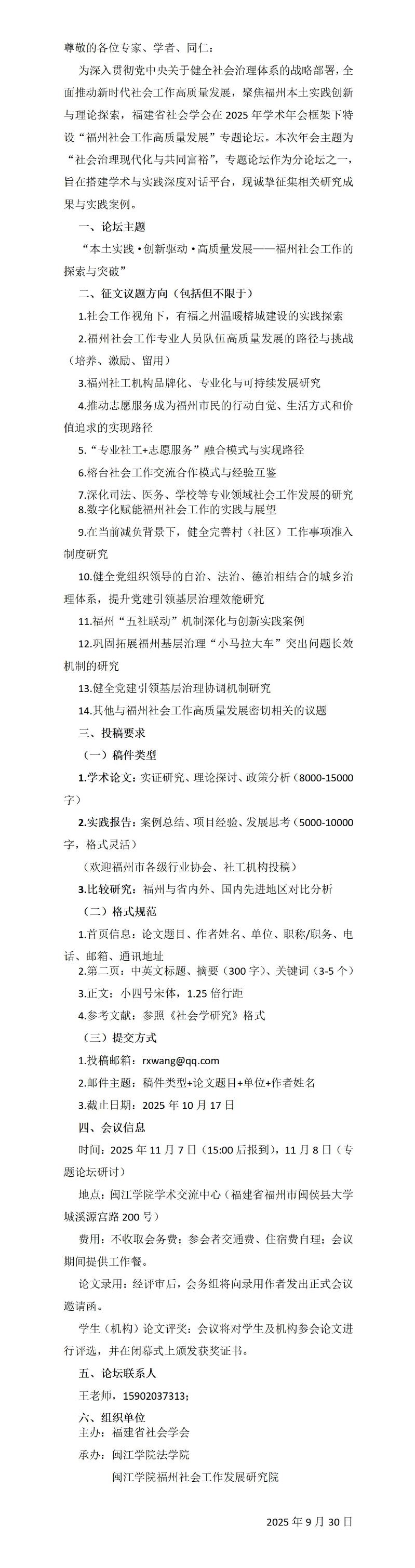 福建省社会学会2025年学术年会 “福州社会工作高质量发展”专题论坛征文通知(第二轮)